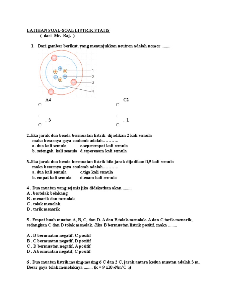 Soal Listrik Statis Smp Kelas Ix from imgv2-1-f.scribdassets.com Listrik statis adalah benda atau partikel bermuatan listrik tetapi tidak ada aliran listrik. Hitunglah gaya yang bekerja pada muatan, jika : Latihan soal pilihan ganda bab listrik statis. Kedua telapak tangan terasa panas setelah saling di gosokkan d. Hukum coulomb diketahui muatan listrik q1 positif dan q2 negatif…… (1) muatan q1 menarik muatan q2 (2) gaya coulomb sebanding dengan q1 dan q2 (3) gaya coulomb berbanding terbalik. Jika dilihat dari asal katanya, kata listrik diikuti dengan kata statis yang berarti diam. Listrik statis adalah kumpulan muatan listrik dalam jumlah tertentu yang tetap (statis), ketidakseimbangan muatan listrik di dalam atau permukaan benda. Muatan c diletakkan di antara muatan a dan muatan b.